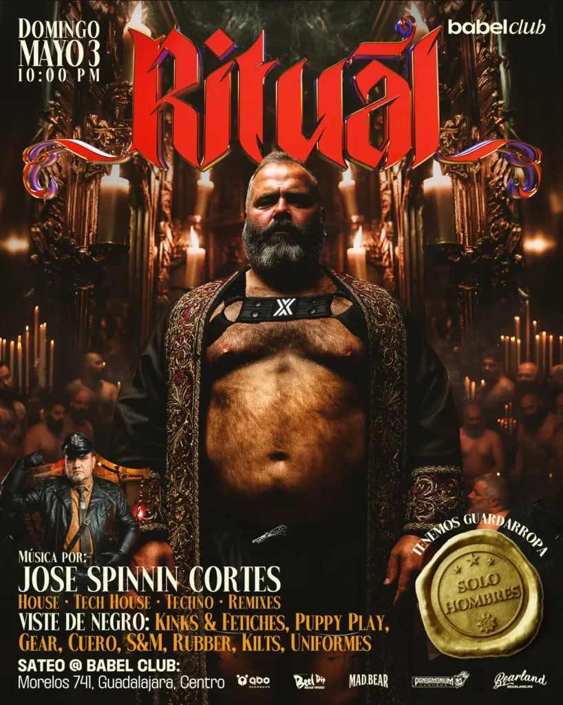 RITUAL – Leather & Fetish Closing Party regresa para su tercera edición en el icónico segundo piso de Babel Club, consolidándose como uno de los momentos más intensos, sensuales y memorables de todo Bearland. Esta es nuestra gran fiesta de cierre: una noche para entregarse al beat, al deseo, a la hermandad y a la energía más oscura, poderosa y magnética del fin de semana.